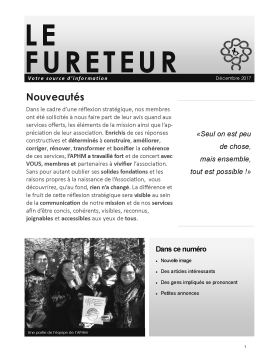 Le Fureteur est un journal qui s’adresse aux membres de l’Association et à leurs proches. Nous tentons d’y inclure des informations utiles ainsi que des nouvelles de l’organisme et de ses partenaires. Nous souhaitons vous laisser aussi une grande place dans les éditions du journal puisque nous croyons que les spécialistes de ce que vous vivez, c’est vous!